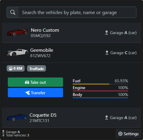 Transfer Garage: Through the outside quick garage UI, you can pay a configurable fee to transfer your vehicle to another public or private garage.