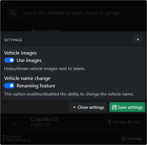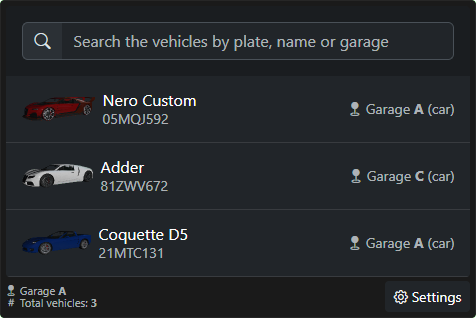 Quick Search Vehicle: When using the quick choose UI, you can use the search bar to quickly search for a vehicle name, vehicle plate, or garage name.