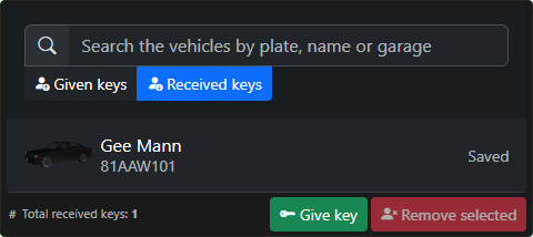 Shared Keys: Shared keys allow you to share your vehicle with others if you give them a saved key. They can spawn your vehicle from your garage even if you are offline. Their access is removed when you remove their saved key.