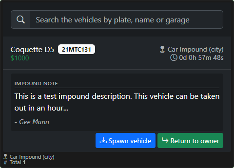 Advanced Impound: When a player impounds a vehicle, you have multiple options; select impound, description, duration and allow un-impound. The allow un-impound option allows the officers to choose whether the owner can retrieve the vehicle themselves when the impound timer expires or if only an officer can un-impound. The impound recovery fee is configurable. A simple event can add vehicles to the impound from external scripts.