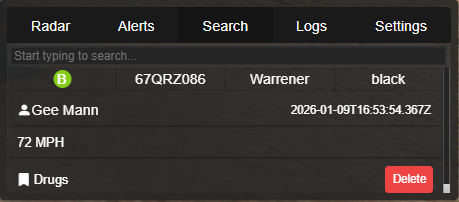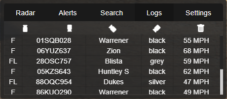 This screen is where all of your ALPR's recent logs will be displayed. Any vehicle your radar scans will temporarily log here for you to view later. It logs data such as the vehicle's plate, model, colour, speed and the camera which caught them. You can filter which camera logs are displayed and also delete all logs. From this screen, you can also right-click and quickly add a vehicle bolo/marker, check the owner of a vehicle, delete a single log or copy the logs data of a vehicle to your clipboard.