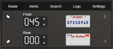 This screen displays the plate and speed readers. It can switch between its 4 cameras and change your target speed limit for each camera to catch speeding vehicles. The radar can auto-lock and ping you when a speeding vehicle passes by.