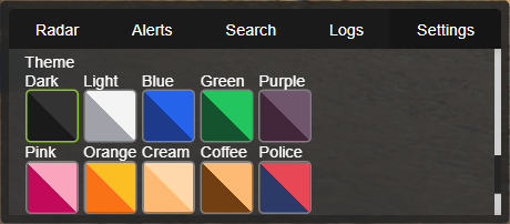 This screen contains all of the settings of the radar, which each player can customise to their personal preference. This data is saved and will re-apply after a relog, server restart etc.