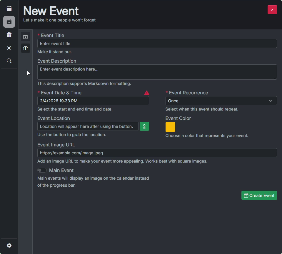 Allows administrators to create new server events by inputting basic data such as title, description, start and end date/time, location and image.