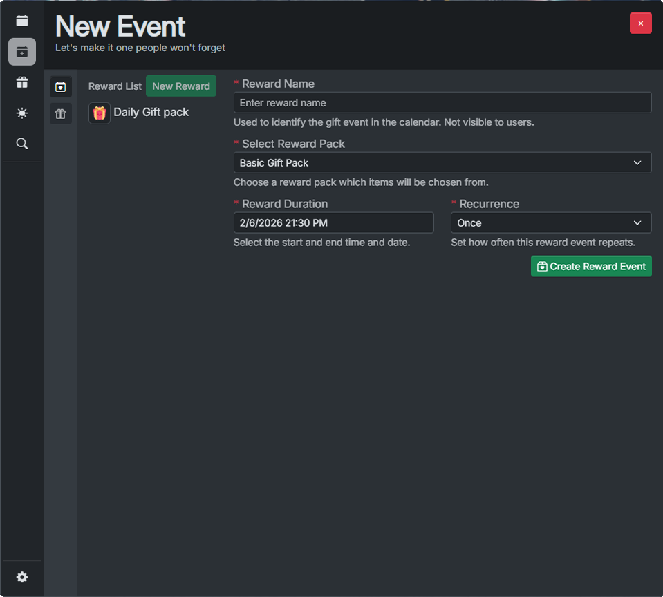 Visible on the #New event page, this page allows administrators to create single / daily / weekly / monthly / yearly scheduled rewards. The reward requires a reward pack to be previously created. Once active each player can draw rewards once per day.