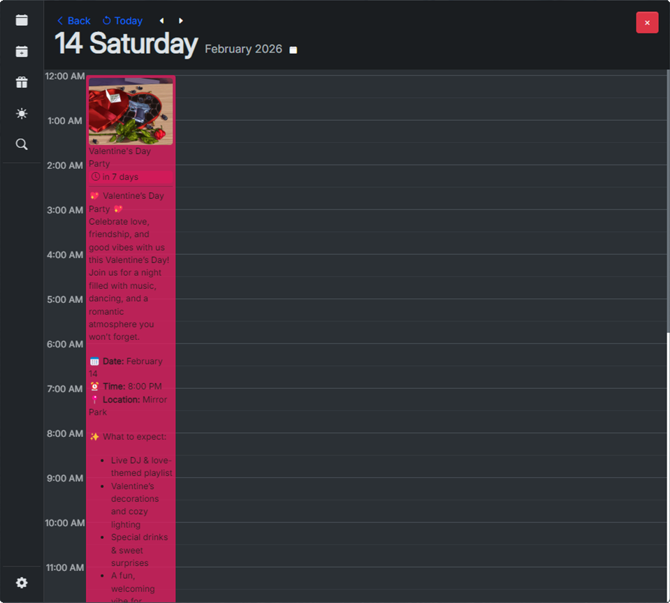 Displays the selected day, including the current time, and the start/end times of the event. This display allows players to view more details about the event as well as sign their attendance.
