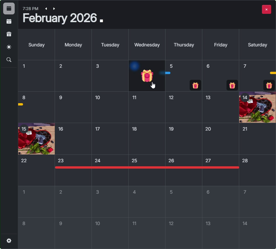 Displays the entire month, including all minor events (the colored bars), main events (picture tiles) and reward drops (gift icons) which can be claimed.